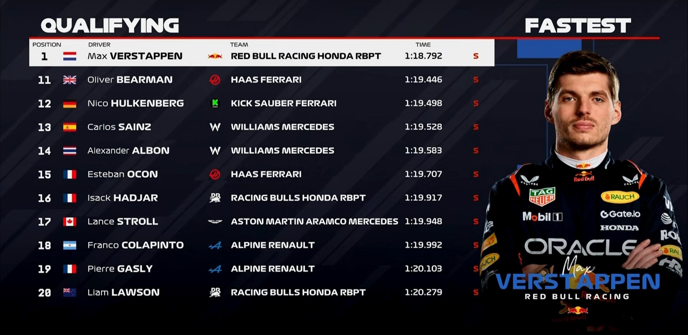 Q2首轮飞驰圈结束,维斯塔潘暂居榜首,诺里斯无有效成绩;